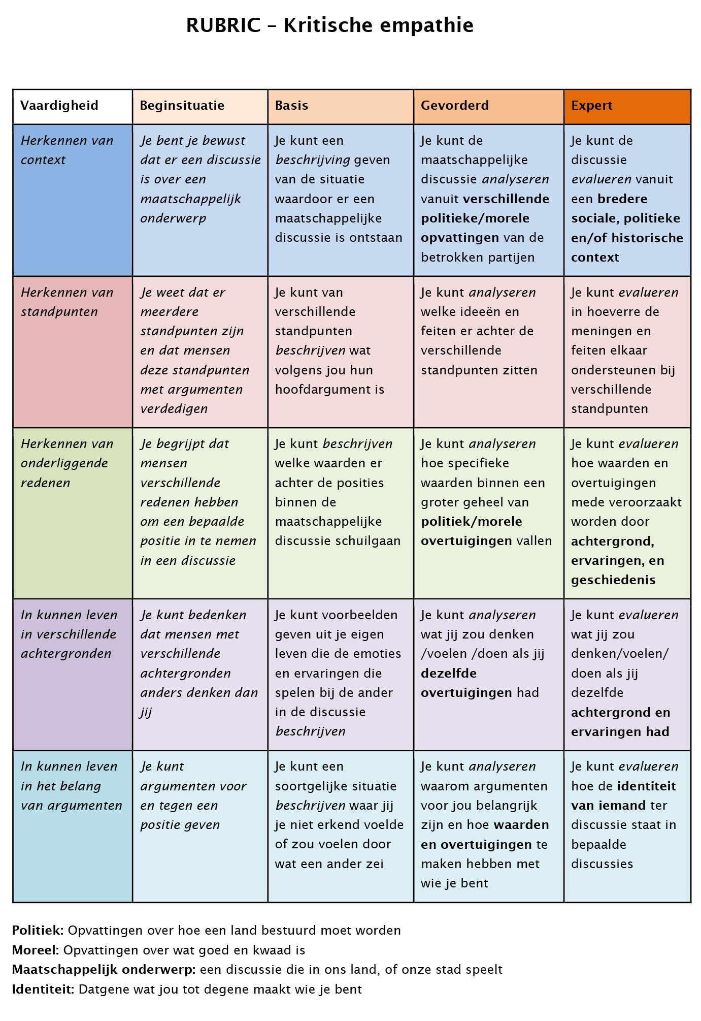Kritische empathie is een lastige vaardigheid om te leren. Je moet de vaardigheid dan ook in stapjes doorlopen. De rubric helpt je bij die stapjes. Je begint bovenaan in de rubric. Bij iedere stap naar onder heb je telkens de informatie van de stap daarboven nodig. Maak dus eerst altijd de eerdere stap af. Je leert dus van boven naar beneden steeds meer onderdelen van kritische empathie.